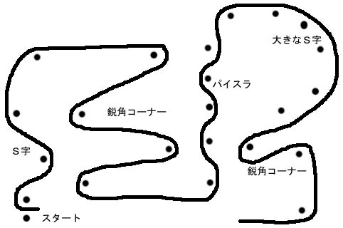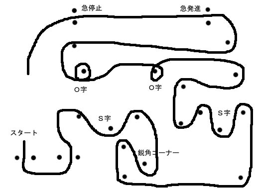 S字から鋭角コーナー、S字、Oの字2箇所、急発進・急制動の一周です。