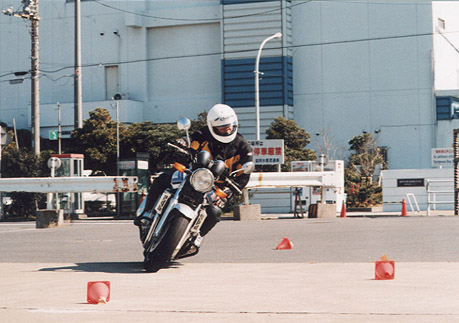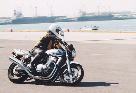 4:イン側ステップを踏み込み、アウト側膝でタンクを押してやる