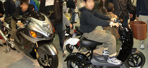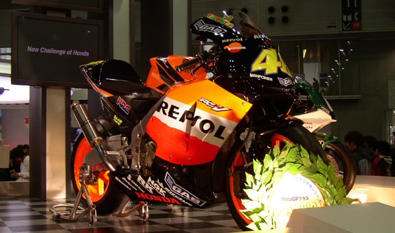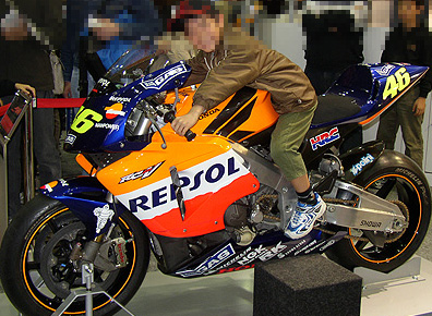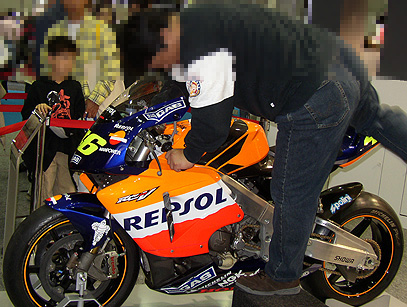 こんなスゴイの(←)より、やっぱスクーター(→)がお似合いですな・・・。 レプソルのモックアップなのか?予備マシンなのか?判りませんが、 跨らせてくれるというので行列に並ぶ事10分。